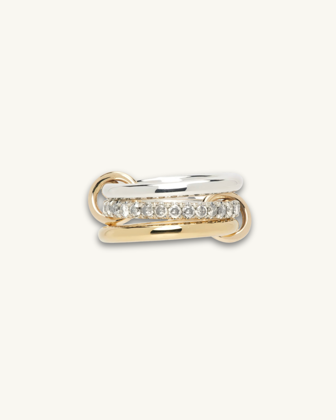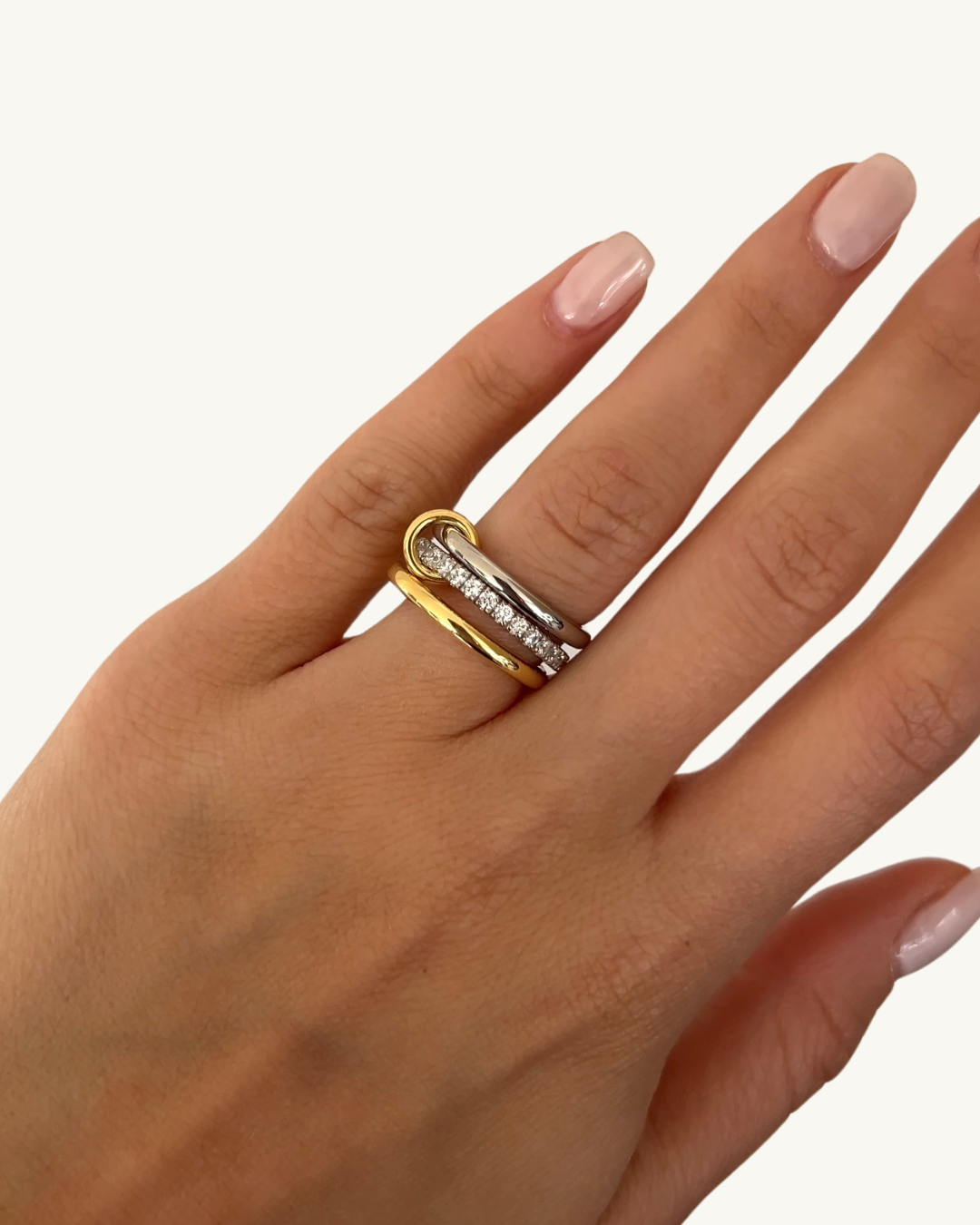 Introducing a new style of our best selling Sienna ring, our Two-Tone Sienna ring offers a modern twist on the traditional design. The set includes 3 solid bands and 1 sparkling pave bands, all connected for a unique and stylish look. Elevate any outfit with this luxurious addition to your jewelry collection.